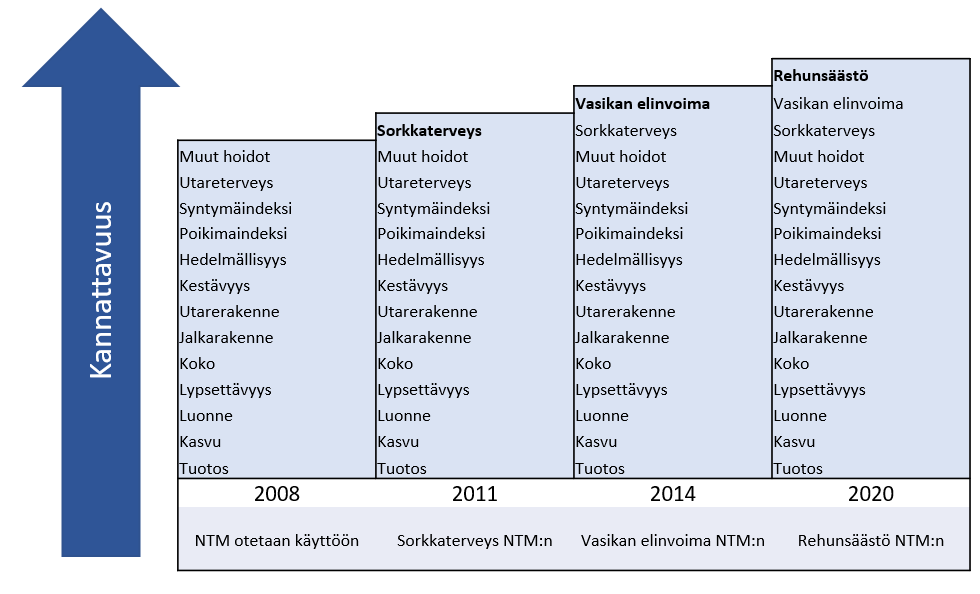 Pohjoismaisen kokonaisjalostusarvon (NTM) kehitys on edennyt kohti kokonaisvaltaisempaa ja tasapainoisempaa jalostustavoitetta. NTM sisältää kaikki taloudellisesti tärkeät ominaisuudet, joista on käytössä jalostusarvostelu. NTM sisältää monia käyttöominaisuuksia kuten utareterveys, hedelmällisyys ja kestävyys. Vaikka näillä ominaisuuksilla on epäsuotuisa perinnöllinen yhteys tuotokseen, perinnöllistä edistymistä on silti saavutettu samanaikaisesti tuotoksessa ja käyttöominaisuuksissa.