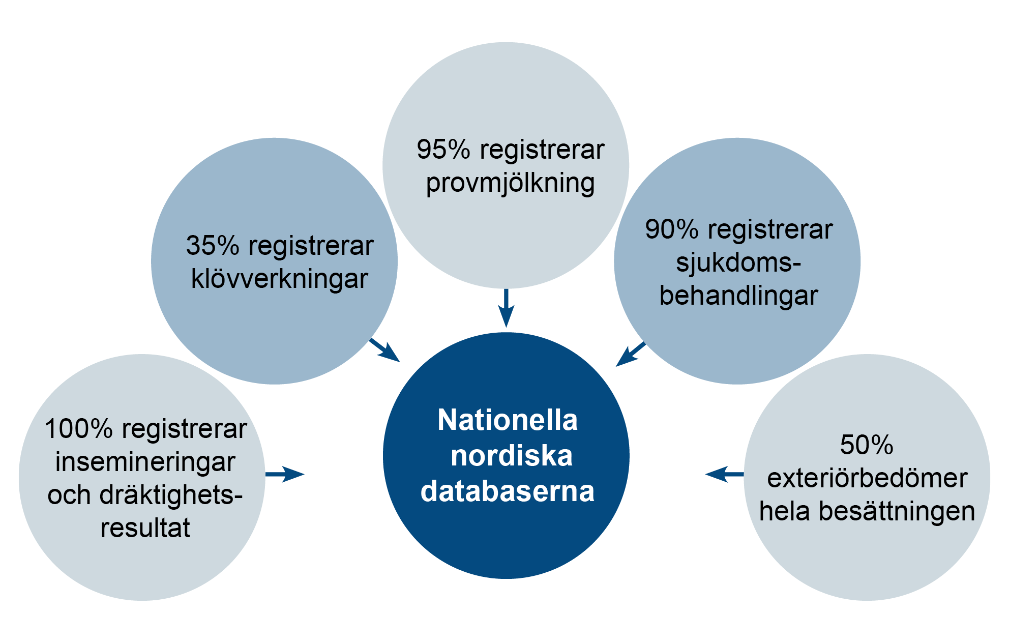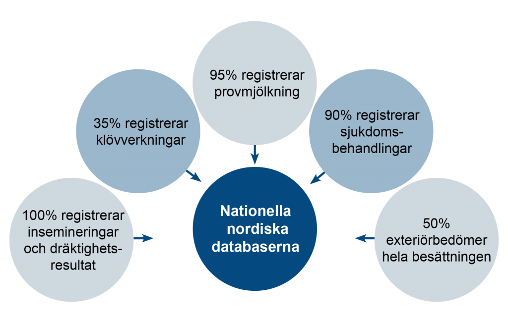 En stor majoritet av de nordiska mjölkbönderna bidrar med registreringar för olika egenskaper till de nationella databaserna. Även veterinärer, seminörer och klövverkare med flera bidrar med registreringar av händelser av olika slag som inträffar under kornas livstid.